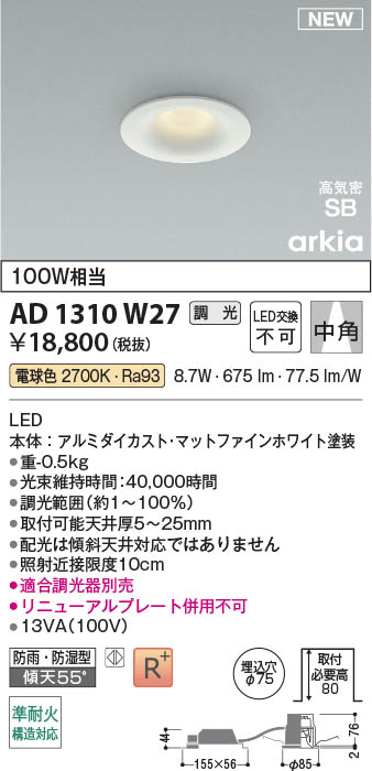 Koizumi コイズミ照明 LED高気密SBダウンライト AD1310W27