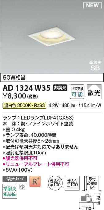 ●幅-□112 出幅-3 埋込穴径-φ100・□100 埋込高-64mm 重-0.4kg